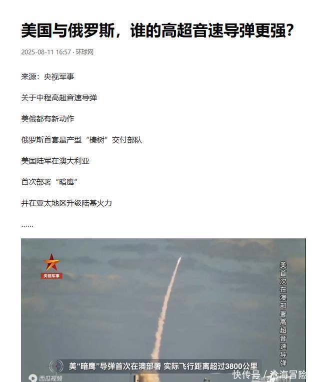 军事专家们已经发出了警告,在《中程导弹条约》失效的背景下,美俄两国在中程高超音速武器上的竞赛性部署,极易引发战略误判,甚至可能将核冲突的风险推向新的高度。 从根本上说,“暗鹰”是美军调整全球作战理念的一个缩影。过去依赖海空力量进行威慑的模式,在面对日益先进的防空体系时,风险成本越来越高。 而“暗鹰”凭借其陆基机动、快速部署的优势,可以实现“打完就跑”,大大提升了自身的生存能力。