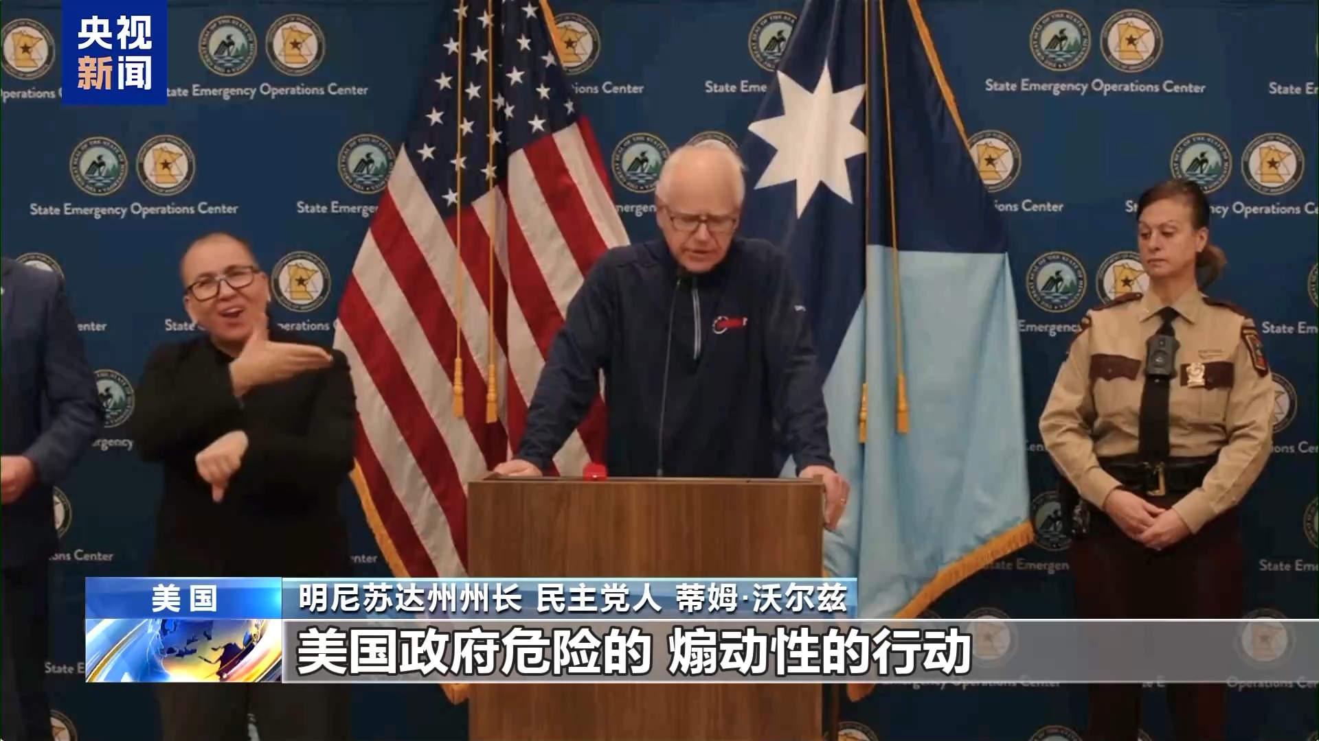 明尼苏达州州长 民主党人 蒂姆·沃尔兹:几周来,我们一直在警告美国政府危险的、煽动性的行动,对我们的公共安全构成威胁,有人会因此受伤。就在昨天,我也是这么说的,美国政府意在制造恐惧、头条和冲突,我们现在看到的就是这带来的后果。